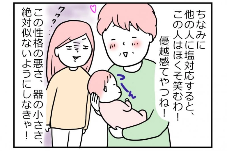 「私にだけ笑いかけてくれる!」という母の優越感。そりゃ毎日乳やってオムツ替えて抱っこして遊んで洗濯して・・・笑いかけるくらいしてくれなきゃ割に合わん!(最低か)ちなみにこの頃、旦那の顔も覚えたようですが、目で追いかける程度で笑うことはなく。イチコの中で、『母(私)>父(旦那)>その他大勢』の順番で認識しているようでした。父を認識し休日にお世話をしてもらいつつ、母をダントツで優遇することで母のプライドを保つ・・・。イチコの策略だとしたら完璧すぎる!ちなみに「そりゃ長い時間一緒にいたら笑顔のタイミングに合う可能性も上がるよね」というツッコミは聞こえませんのであしからず。