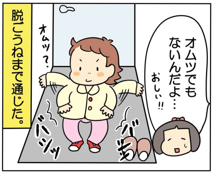 うーん…おしい!!振り返るとお腹を出していたので、一瞬何をしているのかと思いました。(笑)まだお靴は自分で履いたり脱いだりしてくれません。黙って見ていたら、はいっ!と足を差し出します。家来かじいやのように脱がせてさしあげる母なのでした。
