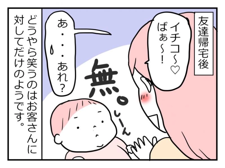 友だちが来たとき限定の、声出し笑い。私も旦那も実家の家族もダメでした・・・。切ない。見慣れない人があやしてくれるのが楽しいのか、たまたまだったのか、外面がいいのか・・・。外面がいいんやとしたら将来有望すぎる!!!