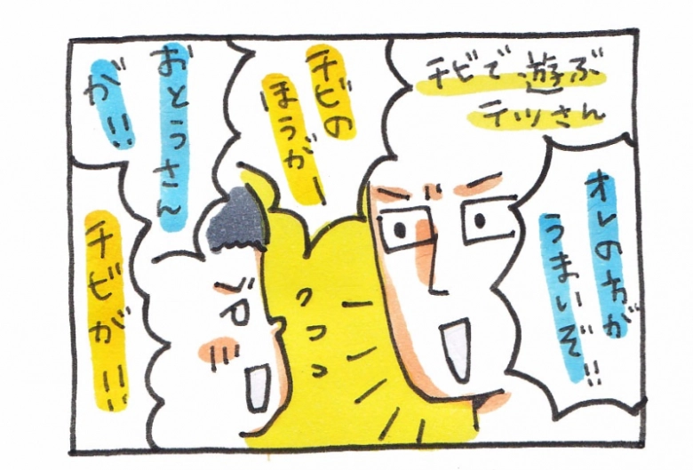 私は家族に「美味しい」とわざわざ言わせたくて、よく質問します。この日はテツが思いきりヨイショしてくれたので気分を良くしていたら、チビが変に対抗意識を燃やしてきました。テツも負けず嫌いなので二人はギャーギャーじゃれ合っていたのですが、そこでネネがこの一言。じゃれ合う二人を眺めるネネの姿は妙にお姉さんで、私はなんだかポカンとしてしまいました〜!