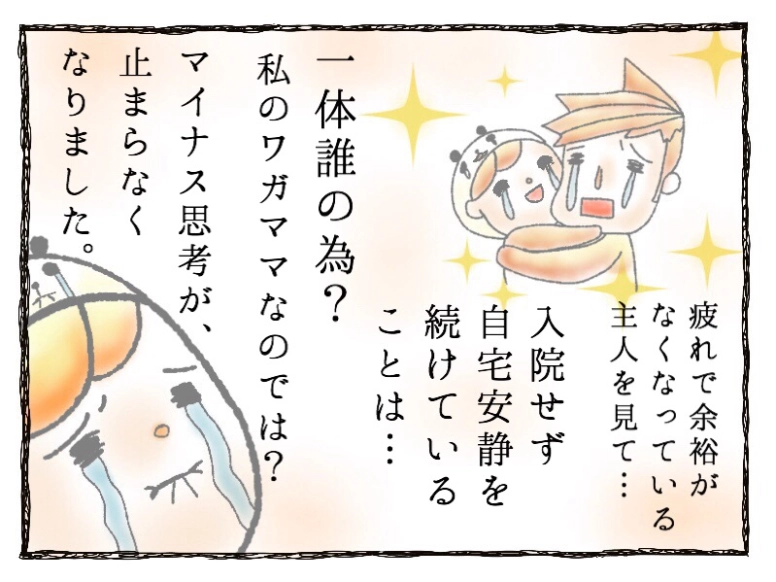 自宅での安静生活を続けてこられたのは、主人が、仕事・家事・育児の3役をこなしてくれていたからです。長らく休みなくフル稼働していた主人の疲労はピークに達していました。