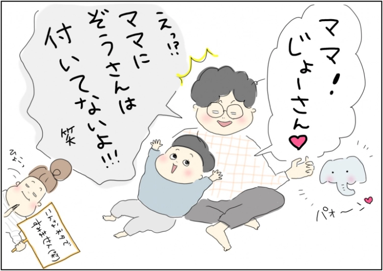 行き違う解釈、、、笑。2人とも頑張ってそれぞれ違うことを主張している、、、笑この光景をしばらく眺めた後、「お母さん象のことだと思うけど」と旦那に言ったらなんか恥ずかしそうにしておりました^^笑これから先こうちゃんが大きくなって父と息子でお酒飲みながら話すようになった時にこのエピソードとかがお酒のつまみになるんでしょうかね〜♪父と息子、いつまでも仲良くね^^