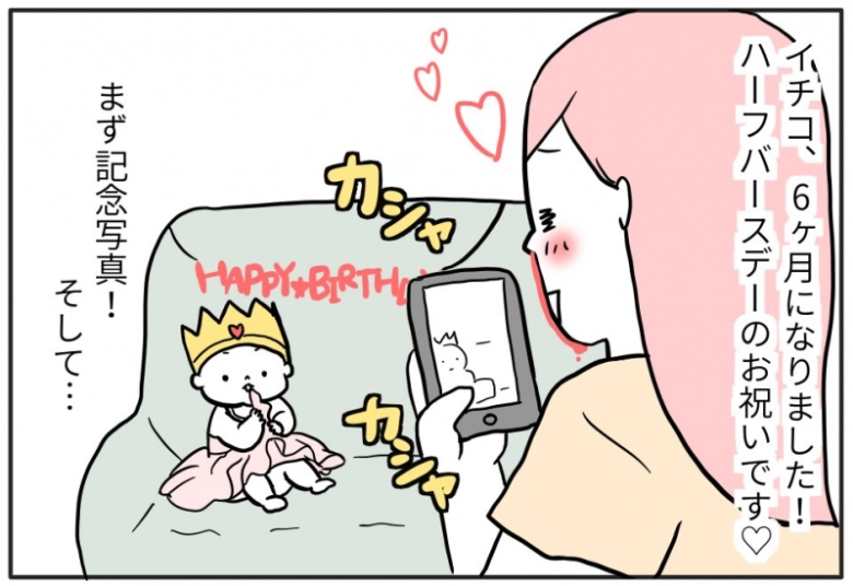 これいまだに謎なんですが・・・ハーフバースデーって何をしたらいいんでしょう?当時まだ離乳食をしていなかったので、かわいいプレートなんかも作らず、プレゼントをあげるほどのことでもない気もするし、写真館行くには先立つものがゴニョゴニョ・・・。ということで、自宅で写真を撮って終わりました。まぁこういうのは気持ちやんね、気持ち!うんうん!
