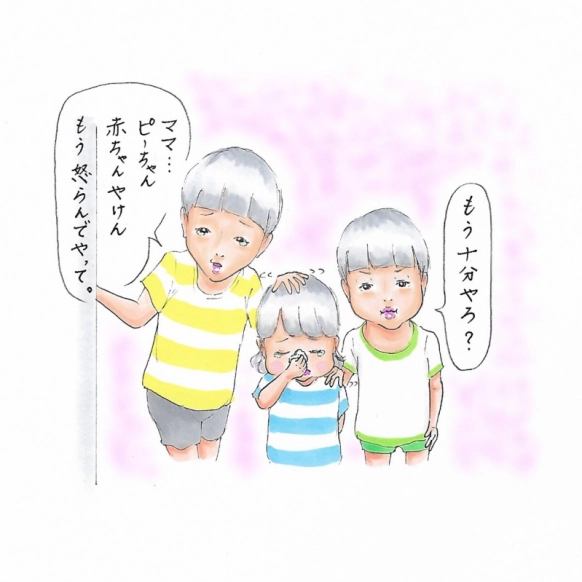 泣いている五男ヒロを囲む、三男イオと四男コウ。『ママ、もう十分やろ?(四男)』えっっ!!?『ピーちゃんは赤ちゃんだから、もう怒らんでやって!』あれ??なんかおかしくないですか?! 叱ってって言ってきたの、君たちじゃないですかぁーー!!理不尽な毎日ですが(笑)ケンカして泣いて、怒って泣いて…賑やか過ぎる楽しい毎日です。