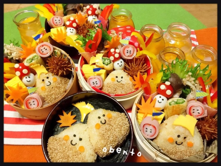 ふたを開けた瞬間、秋の雰囲気が感じられる「かおべん」です。細部まで工夫されたおかずが見事ですね!かにかまで作った”りんご”、そうめんやパスタでトゲを再現した”いがぐり”、うずらとトマトの”きのこ”など、マネしたくなるアイディア満載。子どもだけじゃなく、大人もうれしくなっちゃうお弁当です。