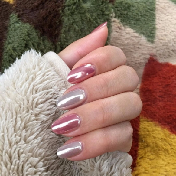 ピンクとシルバーのミラーネイル。美しい光沢が素敵ですね。ミラー効果でストーンなどをつけなくても華やかな指先に仕上げてくれます。クロムパウダーを使えば、セルフネイルでもミラーネイルが作れますよ!ぜひ、セルフでも挑戦してみませんか?
