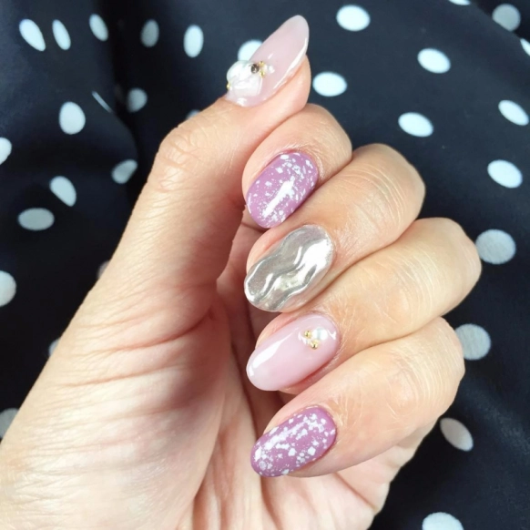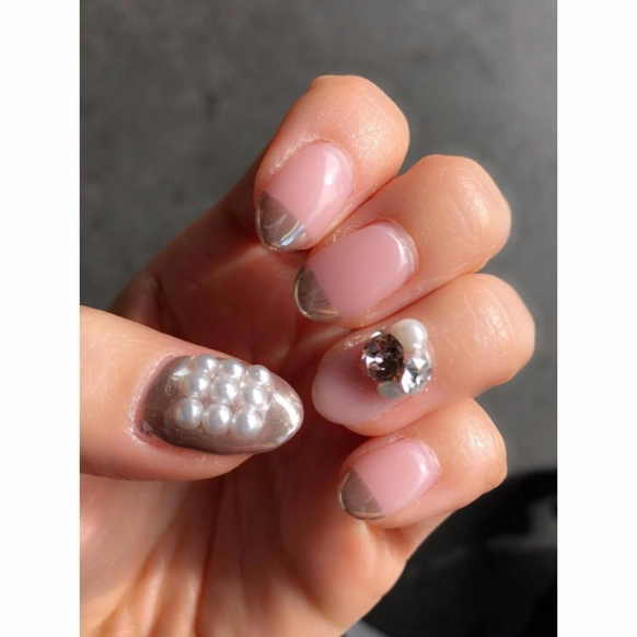 フレンチでミラーネイルを取り入れるのもおすすめ。キュートな印象のピンクとも相性が良く、ミラーネイル初心者でも挑戦しやすいデザインになっています。親指のミラーネイルとパールの組み合わせも◎甘めの洋服と相性が良さそうなネイルデザインです。