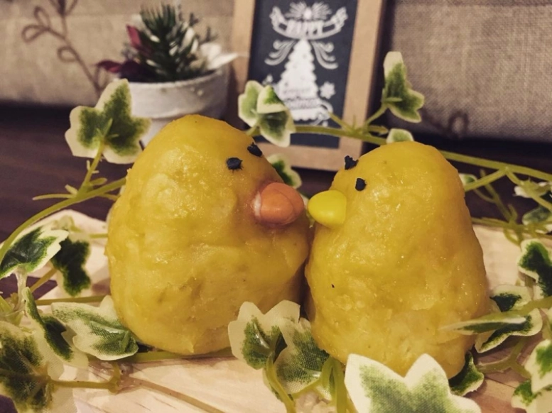 ひよこ型に仕上げたスイートポテトです。立体を表現できるのもスイートポテトならでは。チョコペンやカラーチョコを利用して作ってみましょう。ただし、カラーチョコは色落ちしやすいので焼き上げた後に埋め込むか、低温で焼くことをおすすめします。