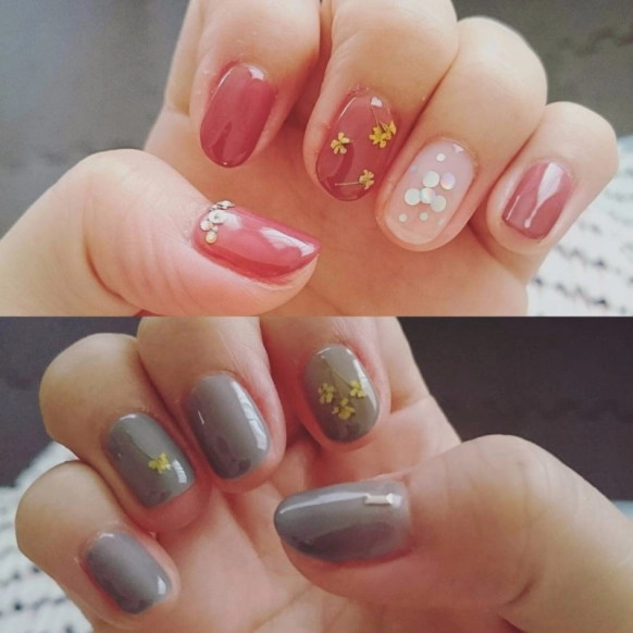 アシンメトリーデザインのネイル。片手はチェリーピンク、もう片手はグレージュで仕上げています。茎つきの小花もとってもかわいいですね♪両手で違った雰囲気を楽しめるアシンメトリーデザインを取り入れてみませんか。