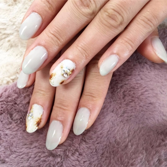 グレージュベースのネイルに2本だけアートを加えたデザイン。大人シンプルなデザインはオフィスでもOK!さり気なくべっ甲になっているのも素敵ですね。服装を選ばないデザインもおすすめポイント。控えめながら、秋の雰囲気を楽しめるグレージュは働くママにもおすすめです。