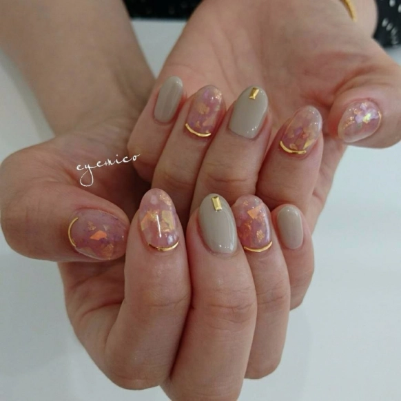グレージュとピンクが女性らしい指先を演出します。付け根のゴールドパーツもトレンド感◎です。上品でフェミニンなデザインは、レディな服装とも相性バッチリ!キュートとクールがうまくマッチしたデザインですね。