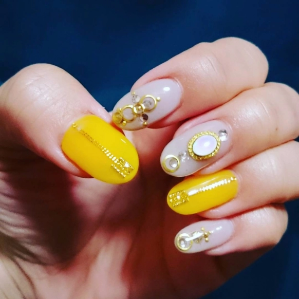 金木犀をイメージした山吹色と大人なグレージュを組み合わせたデザイン。パーツの使い方もおしゃれですね♪ゴールドのパーツが華やかさをアップしてくれます。はっきりとした色使いで、芯の強い大人の女性を表現できますよ。