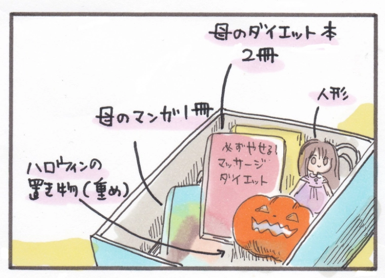 人形はまだしも、ダイエット本は明らかにいらんやつー!!ハロウィンの置物も、ハロウィン過ぎたし、重いし邪魔なやつー!!!外に出て、10数メートルは頑張ってキャリーバッグひきずってましたが、本人も邪魔だと気づいたのか、「これ…おうち、おいていこっか…」と提案してきました。うん。母さんもそれが良いと思う(笑)
