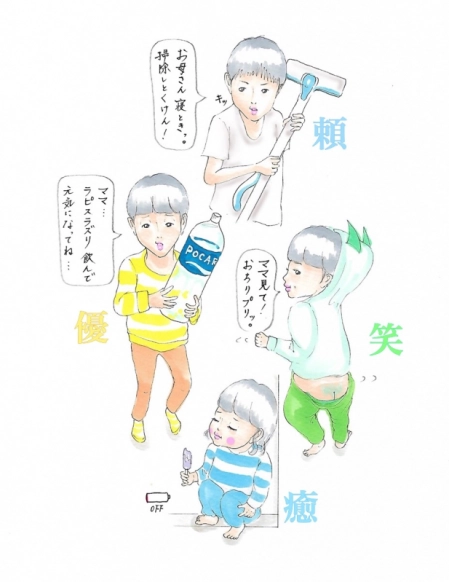 ただ事じゃないと感じ出した子どもたち。指揮官の長男の指示でそれぞれ動き出した!!『お母さんは寝てて』と気遣いの言葉に涙しながら1人寝室へ長男が四男と五男をお風呂に入れている間に次男が掃除機をかける!素晴らしい連携プレーだ!(毎日お願いしたい)その間に三男が飲み物を母へ差し入れしてくれる。『ママ、これ飲んだら元気になるよ!ラピスラズリ・・・』???朦朧としながら考える・・ラピスラズリって何?あぁ・・ポカリスエットって言いたかったんだな三男よ。一文字も合ってないけど(アホかわ)まあ許す。そうこうしていると、風呂上がりのホカホカお尻を見せて笑わせてくれる四男(本当アホかわ)何よりも大好きなアイスクリームを手に電池切れした五男(癒しでしかない)