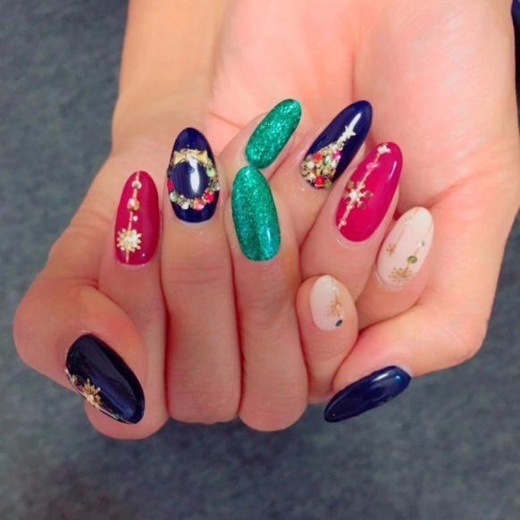 クリスマスカラーに、リース・ツリー・雪の結晶をあしらったネイル。ストーンを利用したデザインに目を奪われちゃいますね!全体的にカラフルな印象を、ネイビーがぐっと引き締めます。クリスマスの時期はネイルを派手にして楽しみましょう!