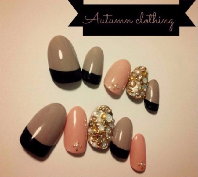 逆フレンチのグレージュ・ベビーピンクに、ストーンたっぷりのキラキラネイルをプラス☆キュートな印象に仕上がります。フェミニンな服とも相性ピッタリ!ほかを控えめカラーで仕上げることで、派手になりすぎません。