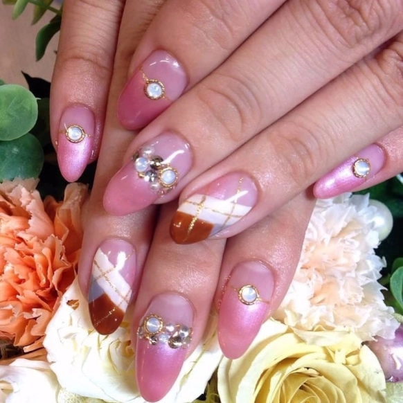 全体をピンクで仕上げたフェミニンなデザイン。アーガイルをプラスすることで、グッと秋冬らしさを演出してくれます!地爪を活かしたフレンチネイルがとってもキュートですね。女の子の憧れが詰まったデザインです♪