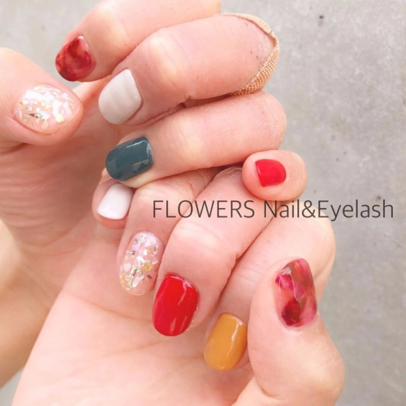 ポップなネイルと相性が良い赤べっ甲。べっ甲独特の透明感が、他のポップなカラーとマッチするヒケツ☆カジュアルなスタイルとも相性バツグンです!たくさんの色を使っているのに、まとまり感があるところにセンスを感じます。