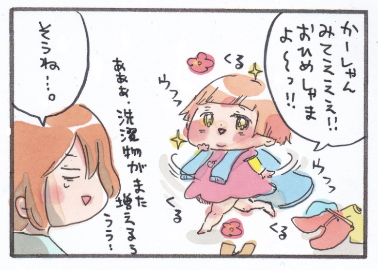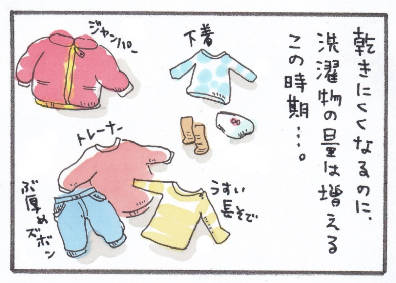 冬で厚着になり、洗濯物が増える時期なのに…!!瀬戸内海の小さな島、直島に生息する母ちゃんです。 体力おばけ怪獣の娘、みーたん(3歳)を子育て中!インスタグラム(@matsuzakishiori)にて、 娘の珍発言・珍行動にツッコミを入れまくる漫画を公開中。