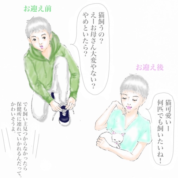 時間にも心にも余裕がなかった私へのご褒美にと、保護猫の里親になることを家族に相談してみると・・・夫は快諾してくれました(ヨシッ!)動物好きな三男・四男・五男は大喜び(ねっこっちゃん♪コール)ポーカーフェイス次男は我関せず・・・(予想通り!)そして最後に長男へ相談(報告に近い)すると意外にも反対される・・・「えー!猫?噛んだり引っ掻いたりするよ!兄弟も多いのに…ペットは飼わない方がいいよ」えぇ・・・そんな・・・