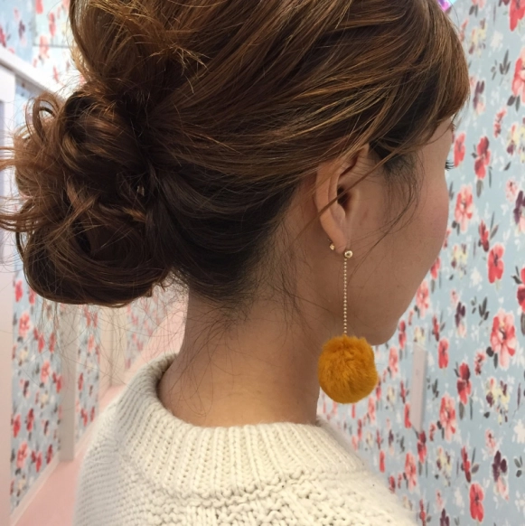低めの位置で作ったお団子ヘアはオトナ女子が取り入れやすいスタイル。ルーズにくしゃっとさせて旬顔に♪<手順>1.低い位置でポニーテールし、全部抜かず毛束を残す2.残した毛束を2つに分け、それぞれ小さなお団子を左右に作りアメピンで固定3.お団子が崩れないよう注意しながら毛束を引き出したり上下に広げたりしてくしゅくしゅ感を出しピンで固定する
