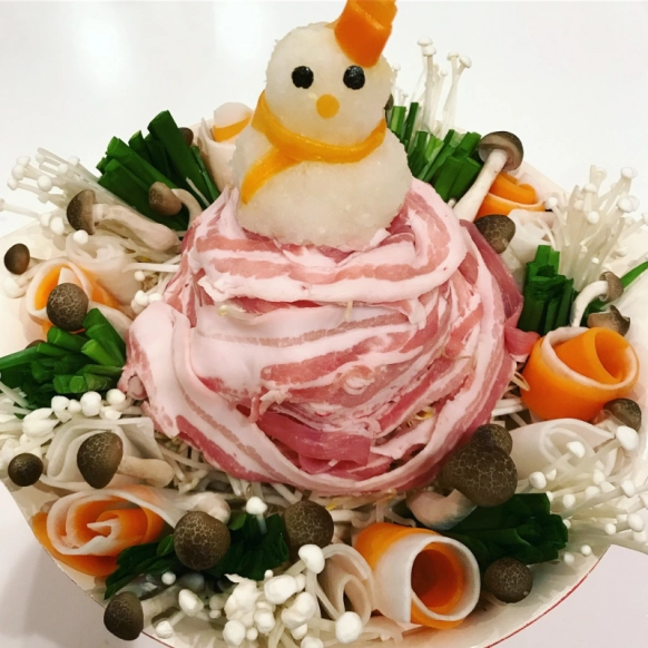 花畑鍋+肉のタワーにキュートな雪だるまをON