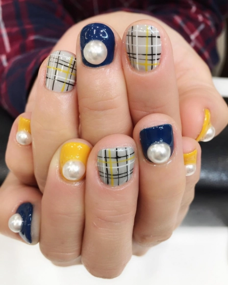 ネイビーとイエローのポップな雰囲気のネイルに、同じカラーを使ったタータンチェックをプラス!大き目のパールが雪玉のような雰囲気で、冬らしさをプラスしています。カジュアルな格好とも相性が良さそうですね♪