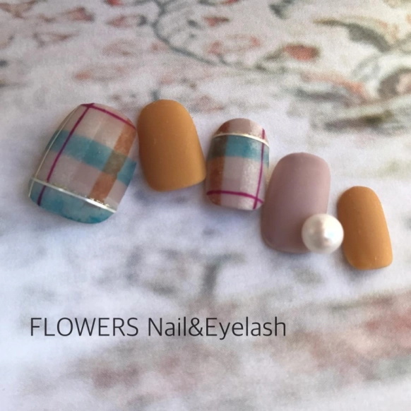 ブラウンとベージュのマットなネイルに、マゼンタ、ターコイズブルー、ブラウン、白のタータンチェックが映えるデザインです。チェックの色の使い方が素敵です♪さりげないシルバーのラインが、落ち着いたデザインにポイントを作ります。どんなスタイルとも相性抜群ですね!