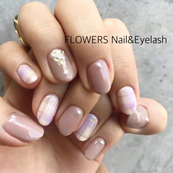 ピンクベージュのネイルをベースに白、ベージュ、淡い紫、ゴールドで作られたタータンチェックがかわいいデザインです。落ち着いた色味はオフィススタイルにもOK!上品にタータンチェックを楽しみたいときにピッタリですね☆短めの爪にも似合いますよ!