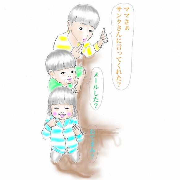 それに比べ、サンタクロースの真の姿を知らないちびっ子三人衆(三男・四男・五男)12月に入ったら直ぐに言ってきた…三男「サンタさんに連絡した?」母「・・・(えっ!もう?)」四男「メールして!早くして!」母「・・っはーい」五男「お手紙かいてね!」それぞれの欲しい物リストをサンタ(とうサンタ)へ連絡・メール・手紙にして伝えました!そしてサンタさんが来てくれた日の明け方…プレゼントを見つけて〜喜んで〜かあサンタが丁寧にラッピングした包装紙をビッリビリに破いて〜欲しかったオモチャに大喜びする姿の動画を撮りたいがために、早起きしてスタンバッている親バカ「かあサンタ」なのです。