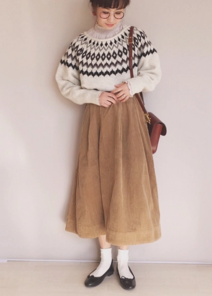 トレンドのノルディック柄ニットとフリルシャツを合わせたyoahiru.wさん。フリルシャツはTe chichi(テチチ)。ミディ丈のコーデュロイスカートと組み合わせることで、温かみのあるナチュラルスタイルに☆襟と袖からのぞくフリルと、足元のバレエシューズで、カジュアルコーデにきれいめ要素をプラスしています。