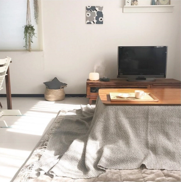 こちらのリビング、おしゃれの秘密はグレー調の色味で揃えているところにあります。グレーカラーをこたつにも取り入れることで、他のインテリアと馴染み、すっきり片付いた印象に仕上がります☆