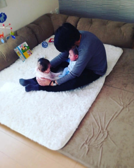 ふかふかのカーペットが付いたローソファ―。双子のベビーとパパ、ママが座ってっもみんなでくつろげるそう。カーペット部分は取り外し可能。丸ごと洗いができるところもうれしいポイントです。「L字型フロアコーナーソファセット」27,900円(税別)