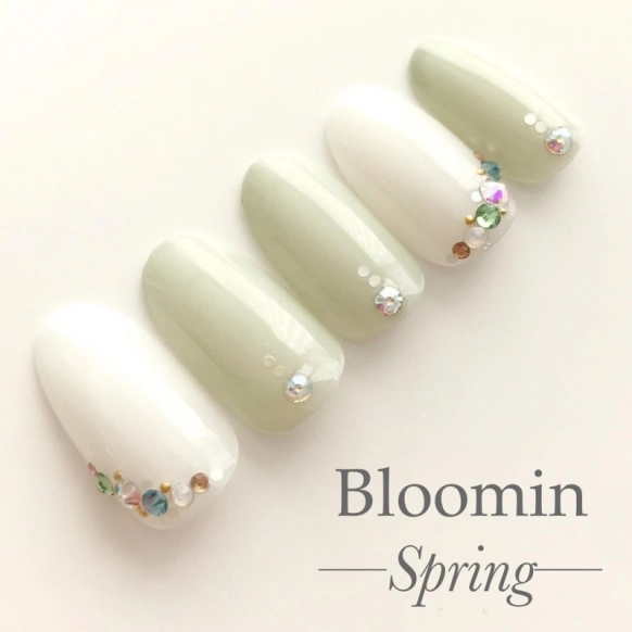ピンク系は苦手だけど、明るいカラーが使いたい方におすすめなのがこちらのデザイン♪ 春らしいパステルグリーンとカラフルなストーンで、シンプルながら華やかな指先に。ヌーディや色味ではないのも、周りと差をつけられそうですね。