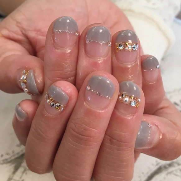 グレージュのみを使い落ち着いた配色ですが、全面を塗るのではなく直線フレンチにすることで抜け感が演出されていますよね。ビジューストーンをアクセントにして華やかさも忘れずに。