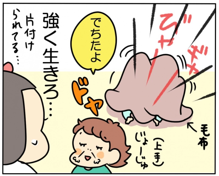 いつもは気が向いたときにしかしてくれないお片付けだけど、出掛ける前やおやつの前は「はーい!」と良いお返事をして取り掛かってくれます。キレイになったらどっしり座っている弟が気になったのでしょう。布団を被せて…はい、完成~!(笑)わけもわからず片付けられた弟は今日もめげずにお姉ちゃんの後ろを追いかけます。