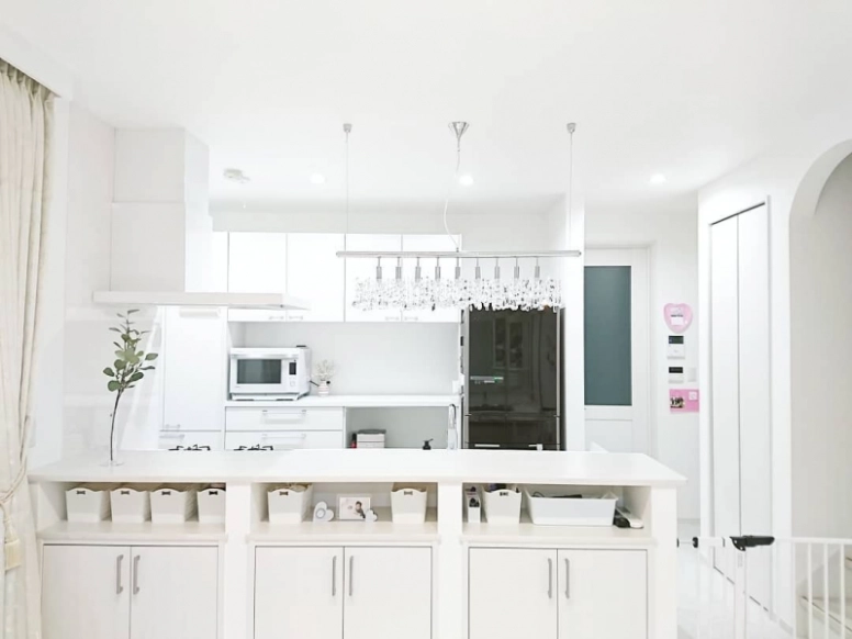 オールホワイトのキッチンがおしゃれでキレイな@ hy_____homeさんのキッチンスペース。ボード下に使われているホワイトの収納カゴに注目してみると、すべてカラーテイストが統一されていることが分かりますよね。たくさん収納カゴを使ってもごちゃついて見えない技アリのカラーテクニックは、今すぐ真似したい収納方法です。