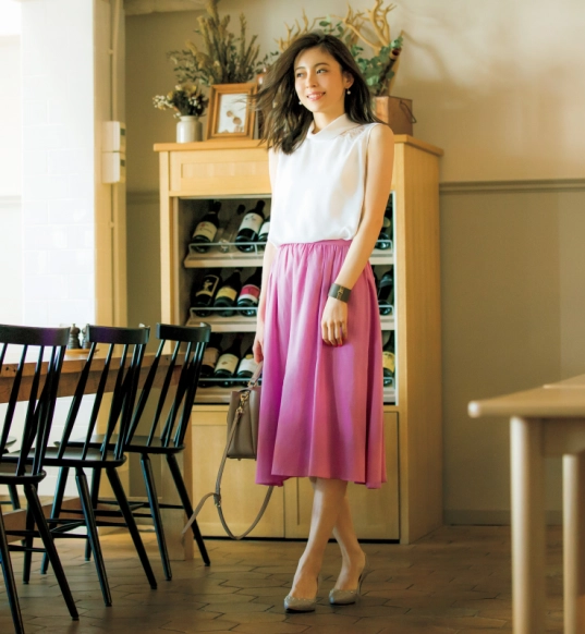 とろみ感のあるノースリーブブラウスは、上品な大人のイメージになりますね。ロマンティックなカラーのピンクスカートが、エレガントさをUPさせています。こちらの写真のように洗練されたコーデは、アクセサリーやバッグがシンプルに☆アクセントをあえて加えずコーデをシンプルにすると、美人オーラをまとうことができるでしょう。