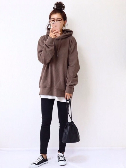 メンズのスウェットプルパーカをオーバーサイズでおしゃれに着こなしている@maki_h.aさん。トップスはオーバーサイズに、ボトムスはコンパクトに。シンプルでボーイッシュなコーデには、@maki_h.aさんのように大ぶりピアスなどで女性らしさを取り入れるのがおすすめ♡