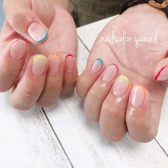初心者でも簡単で挑戦しやすいデザインのひとつ、フレンチネイル。このフレンチネイルで細フレンチにも挑戦してみましょう♡選ぶカラーは夏らしいビタミンカラーや@nailsalon.yunailさんのような蛍光カラーがおすすめです。フットネイルは細フレンチにせずベタ塗りで、手と足をリンクさせてもよいですね♡