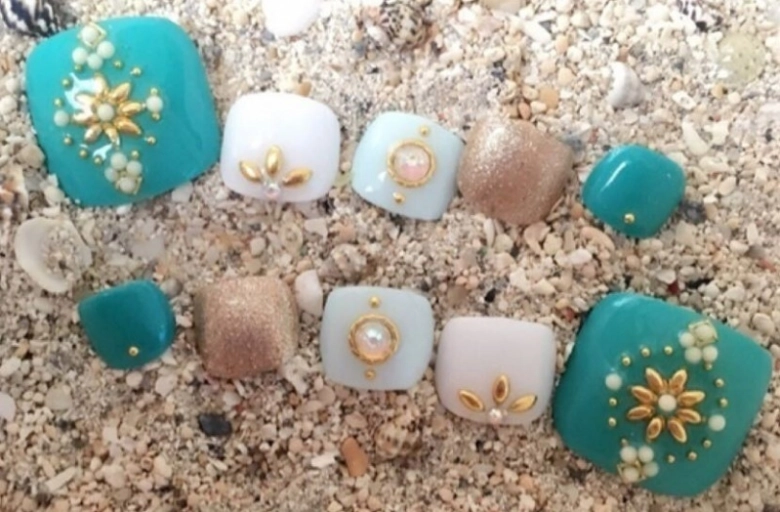 夏の定番カラー、ターコイズ。グリーン寄りのブルーが爽やかさをプラスしてくれます。そんなターコイズをモチーフにしたデザインネイルは、浜辺にピッタリ!@may_nail27さんのようにパールやスタッズを散りばめると、ヌーディーな素足にジュエリーをつけたような大人かっこいい仕上がりになります。