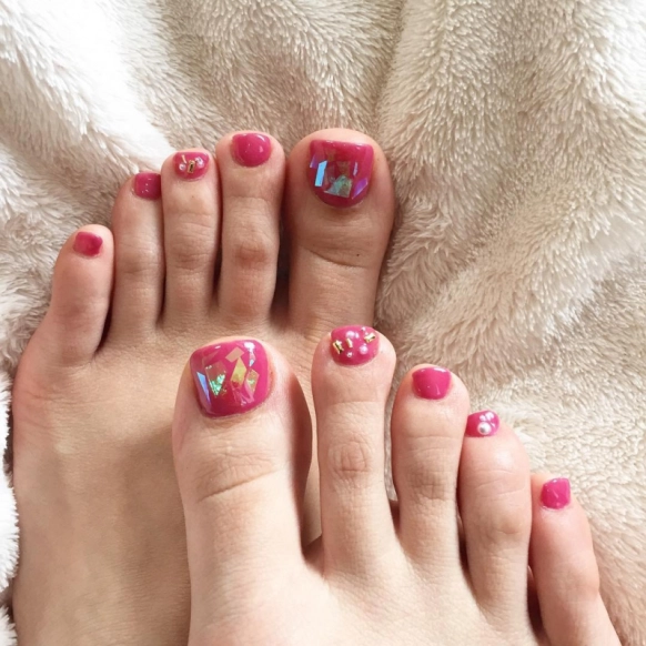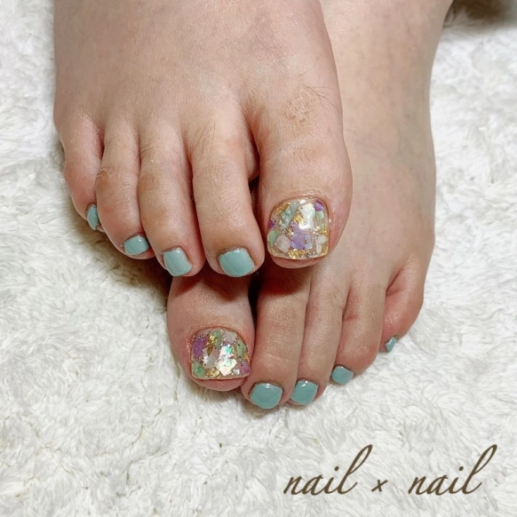 親指にのみ、たっぷりのシェルとラメをのせて。夏に向けてテンションをあげたキラキラフットネイルです。親指以外はちょっと控えめなエメラルドグリーンのワントーンにして、全体のバランスを整えています。足の爪は指に比べ小さい場合が多いので、親指にデザインやアクセントを入れるとバランスが良く、見栄えも良くなりますよ。