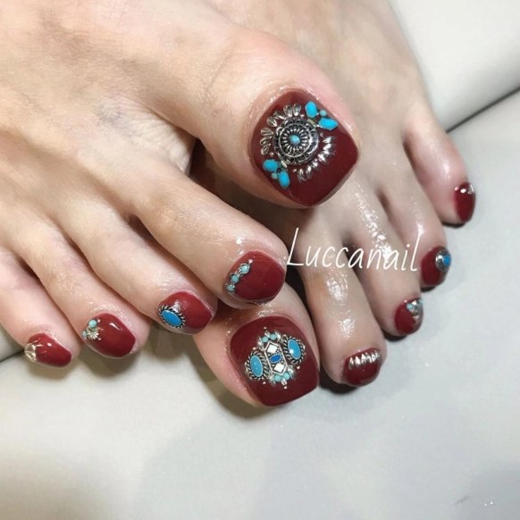 こちらは、茶色と赤の中間のようなダークチェリーというカラーと、シルバー×ターコイズのデザインをかけ合わせた単色カラーのフットネイル。インディアンジュエリーのような個性的で繊細なデザインが、一際おしゃれな足元を演出してくれています。これくらいしっかりと主張があっても足元なら目立ちすぎないので、ちょうどいい感じになるんです!