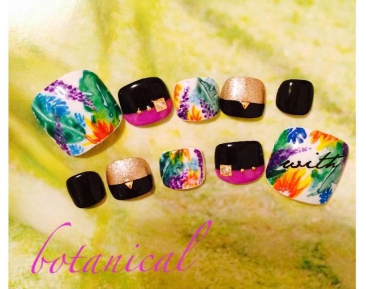 2019年夏のトレンド柄のひとつ、南国風の植物がデザインされたボタニカル柄です。派手な印象になりがちなボタニカル柄は、フットネイルでさりげなく取り入れて楽しむのもアリ♡@may_nail27さんのように、シックなブラックやエレガントなゴールドをミックスしたフットネイルなら大人っぽく仕上がりますね。エッジィなスタッズをオンして、かっこよくキメましょう。