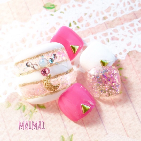 アニメが完結しても人気が衰えない「美少女戦士セーラームーン」。いつの時代も女性たちを魅了するセーラームーンを、@maimai_shufunailさんはフットネイルにオン!キラキラと輝くストーンがティアラのようですね。カジュアルになりがちなボーダー柄は、ゴールドでラインを引くことでおしゃれに格上げ。こちらのネイルは100均のネイルで作ることができるというのだから、これもまた驚きです!
