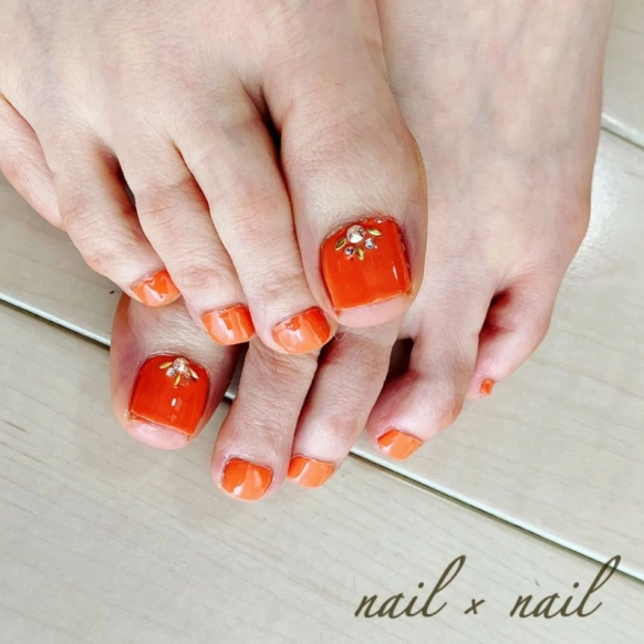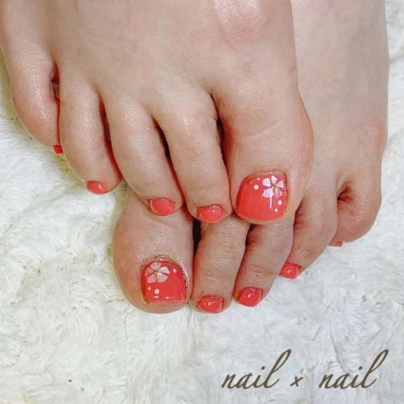 華やかなコーラルピンクのアクセントに、シェルで作ったお花を入れた単色フットネイル。シェルの上品な輝きとシンプルなデザインが単色カラーとマッチして、派手すぎないお花ネイルに仕上がっています。上品なコーディネートにも合いそうなフットネイルですね。