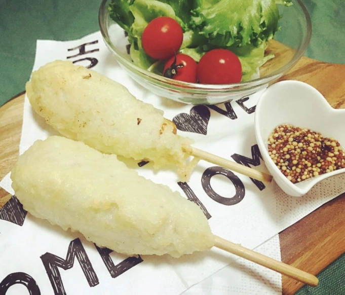 茹でうどんが、子どもに人気のアメリカンドッグに大変身!茹でうどん・片栗粉・薄力粉・砂糖を袋に入れて、全体が混ざるように振ります。風味を追加したいときは、粉チーズも入れてみましょう。竹串に刺した魚肉ソーセージに、粉をまぶしたうどんを巻き巻き。油で揚げれば完成です。