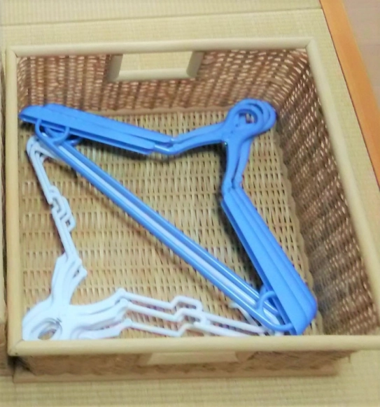 先ほどもご紹介したかごを使った収納。リビングにハンガーを収納するなら、ごちゃついて見えるハンガーをとにかく見えないように収納したいもの。かごを使えば、入れるだけで収納完了!急な来客でハンガーをしまいたい、というときに便利に使えます。