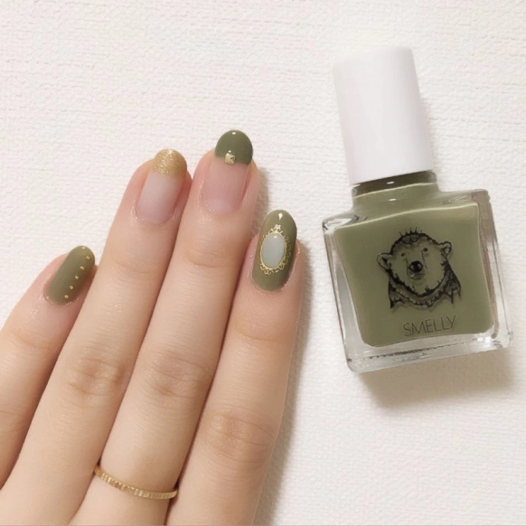 秋はスモーキーなカーキを使ったネイルがおすすめ。ワンカラーしか使っていなくても、スモーキーなカーキなら秋らしくオシャレに見えますよ♡ゴールド系のパーツと相性がよいので、ぜひ試してみて!