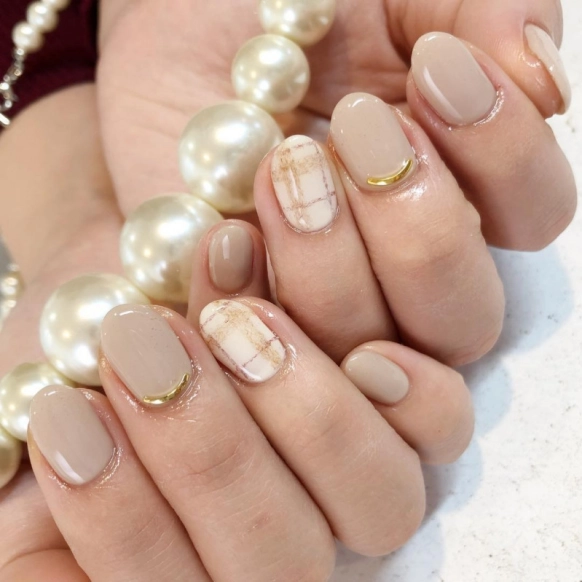 スモーキーなベージュと、冬らしいブランケットネイルを組み合わせたデザイン。スモーキーネイルは冬と相性抜群ですが、ブランケットネイルをプラスすることで、よりほっこり感がアップしますね!さりげなくゴールドパーツを取り入れることで、大人な雰囲気に♡オフィスネイルにもピッタリです。